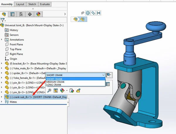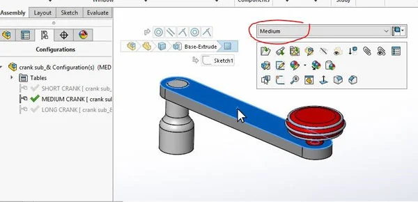 I have fitted these together in another assembly, called “crank sub”, I then created configurations of this assembly, and I just used the drop down selection list to swap the configurations of the parts that the assembly configurations use: