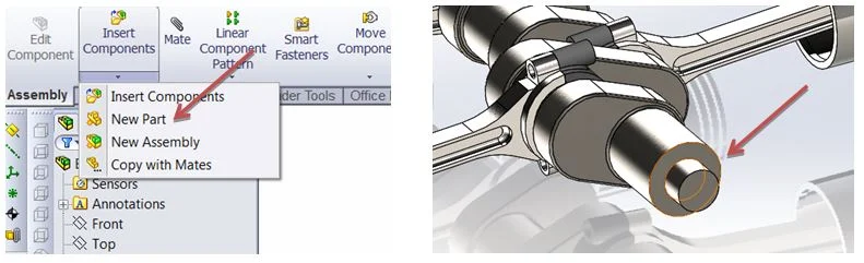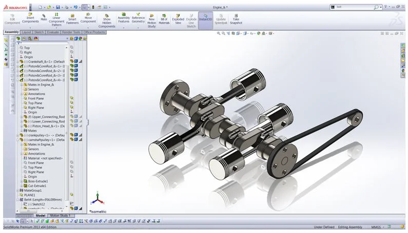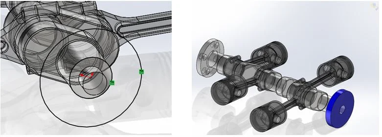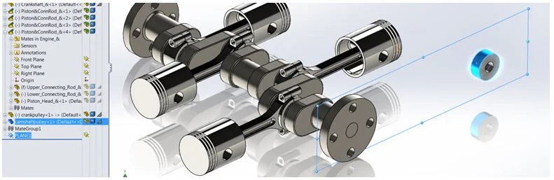Top-down modeling from Assembly Modelling is a prime example of this, and will be the focus of this article. By ‘top-down’ we refer to creating parts in the context of the assembly as we go, as opposed to the more commonly used ‘bottom up’ method, wherein all the parts are created separately. The intention with the crank shaft model seen below is to add a pulley.