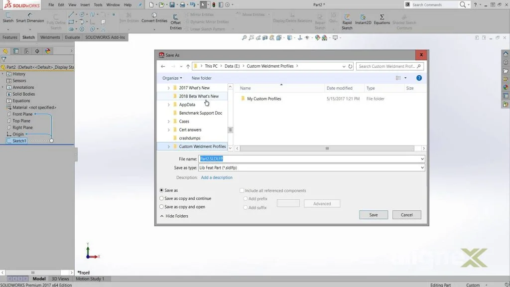 With the sketch drawn and dimensioned out, I am now ready to save the profile. We select the sketch from our feature manager design tree and go to save as. In the save as type drop down, we choose library feature part. We can save our profile in the default location which holds the standard weldment profiles, but we can also save the profile to some other location such as the documents folder, a shared drive or a PDM vault. I will place mine in a new folder.