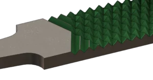 Once completed, this pattern can be copied across the plane of symmetry (right plane) to create the finished knurling feature. Again, the Geometry Pattern feature should be used for maximum performance.