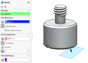 Then, create a plane perpendicular to the line. The simplest approach is to create a plane by using the line segment as the first reference, and one of the endpoints as the second reference.