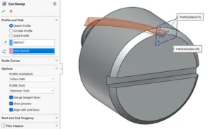 Now, create a Swept Cut feature using the created profile and path as the selections. Depending on the total curvature of the Helix you defined and the relations used to define the profile (parallel and perpendicular are preferred over horizontal and vertical) you may have issues with twist, in which case guide curves, direction vectors or other alternatives may be required. However, in most cases, simply setting the Profile Orientation option to Follow Path and the Profile Twist option to Minimum Twist should be sufficient.