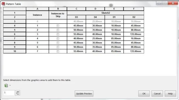 Variable pattern is one such type which lets you arrange the features as per the selected dimensions. The pattern table can be modified to vary all the instances on a planar or curved surface.