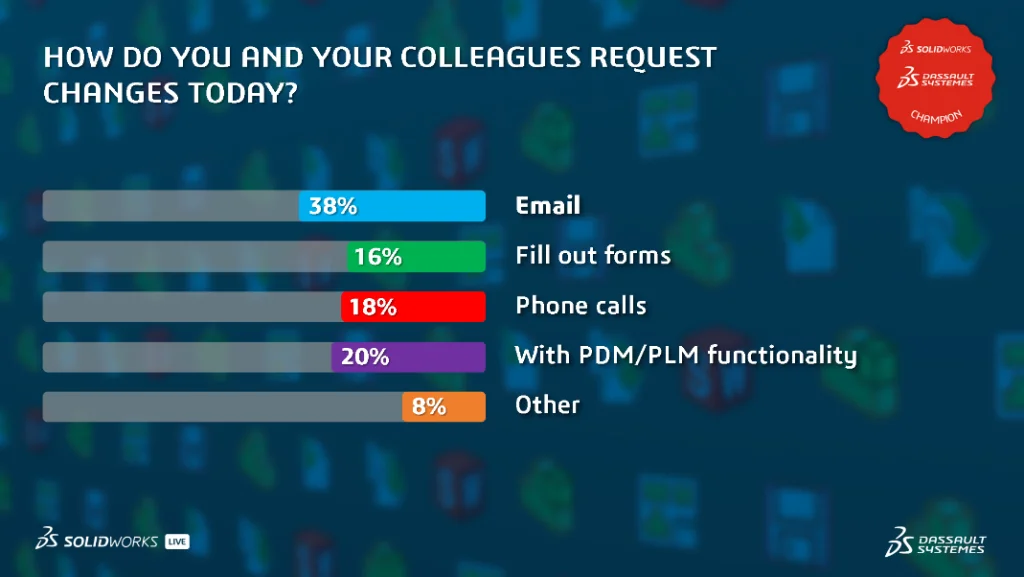 It’s amazing how prolific email still is! More interesting is that forms and phone calls are right up there as well. These methods work, without a doubt. However, they completely disconnect the request from the design, usually leaving the organization struggling with traceability, duplicate file attachments, and signed physical forms. With the 3DEXPERIENCE Platform, all of this can be connected – out of the box.