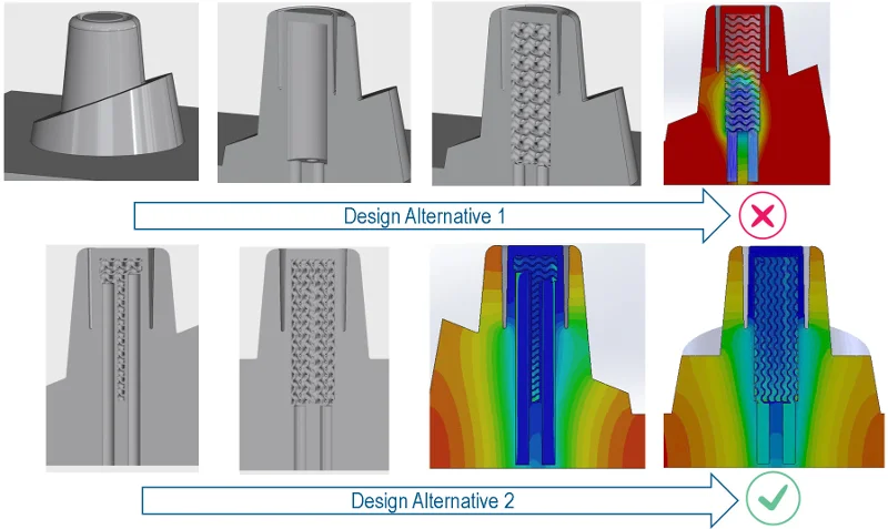 When it comes to heat exchangers or injection mold design, cooling down temperatures is very important. Both injection molding and heat exchangers design can leverage lattice structures as it provides a larger surface area to increase heat exchange and accelerate temperature cooling. In plastic injection mold design, for example, lattice structures can be used to cool down the mold faster after each injection.