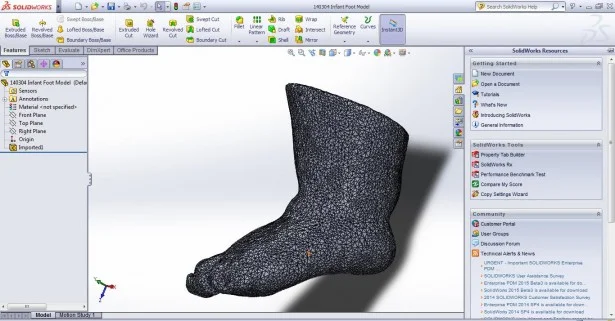 We returned to the Design that Matters studio. Will took a 3D scan of a newborn doll’s foot and imported it into SOLIDWORKS. He then scaled the resulting file to generate multiple size feet representing premature to term newborns. Using the feet as a marker, he then sketched the all-in-one newborn shoe pulse oximeter. SOLIDWORKS was the perfect tool to quickly replicate the curves of a shoe in the right size and shape to fit well on a foot.