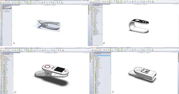 Another observation we made at Brigham and Women’s NICU is that there is one pulse oximeter for every baby. Each baby is monitored continuously during their stay ranging from hours to months. In developing countries, many healthcare centers and hospitals don’t have a single pulse oximeter. We realized the need for a tool that community health workers or nurses could use to make quick checks on many newborns. We were inspired by cheap clip-on adult fingertip pulse oximeters available at local drug stores in the United States. Our MIT and Rhode Island School of Design student team and DtM Designer Will Harris both used SOLIDWORKS to explore a variety of clip-on forms.