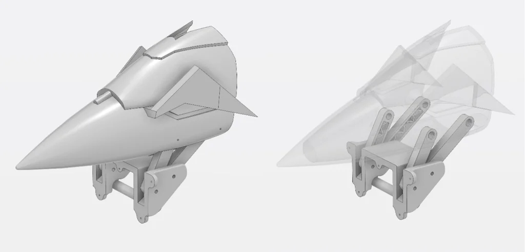 The main mechanism that allowed the beak to move was a 4-bar linkage. This is a specific mechanism that consists for four bars all connected at joints to move between two critical positions. In the costume, it was used as a lever to move the beak up to Adrian’s head and down to a resting vertical position on the chest.