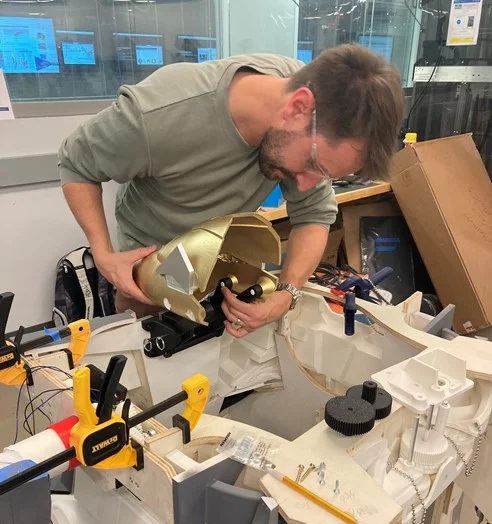 The motor that Yun Li selected could generate only 1 foot-pound of torque. This created a new challenge for the team as the moving components of the costume (including a factor of safety) required 40 foot-pounds! Yun Li called upon fellow builder Sal Lama to help figure out a way to transfer the motor’s power to move all of that weight. The solution? A gear train.