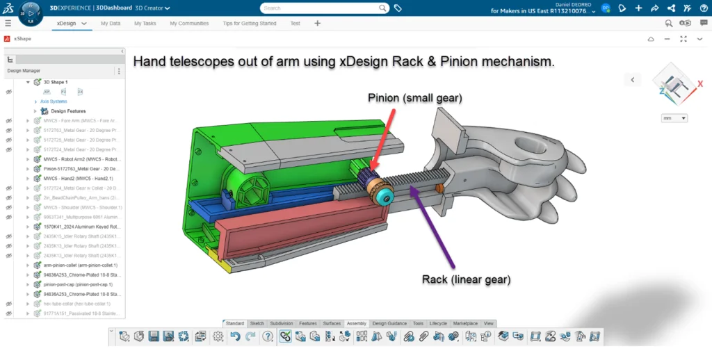 He started modeling all of the arm pieces and parts based on Albert’s design. After importing some gears he found on McMaster-Carr, Dan used the Gear command to animate them in xDesign. The gears turned the shoulder using a 5:1 ratio. He then used one of the driving gears from the shoulder to drive a rack and pinion at a 1:1 ratio so that the hand telescoped out of the arm while the shoulder and arm all rotated together!