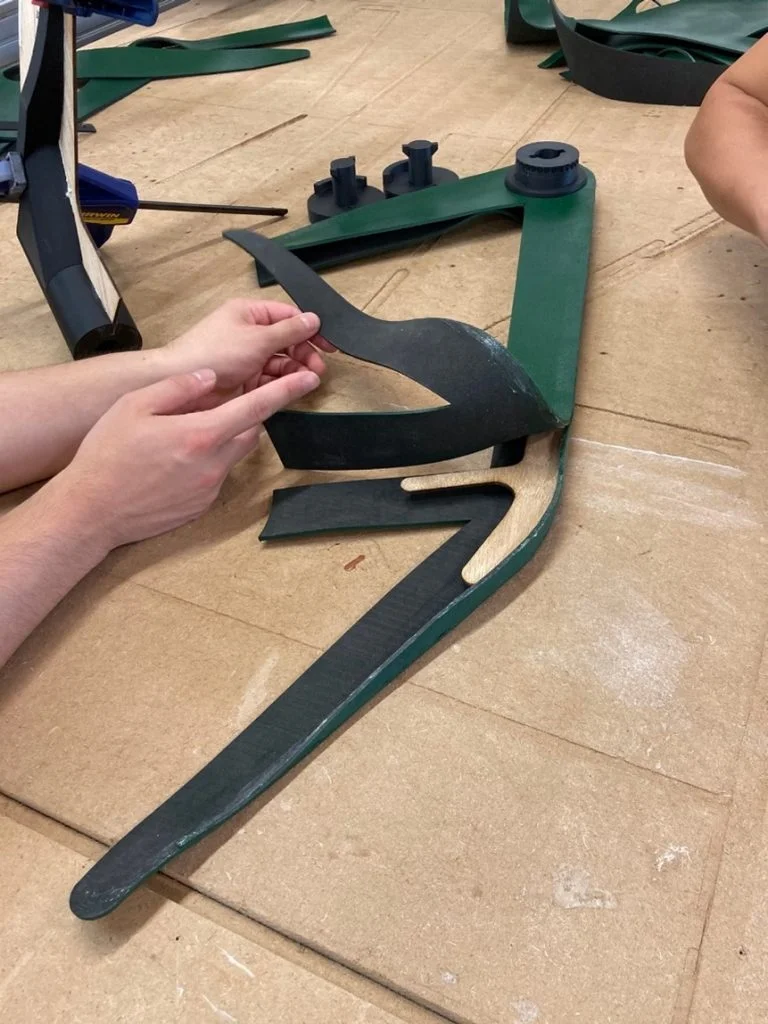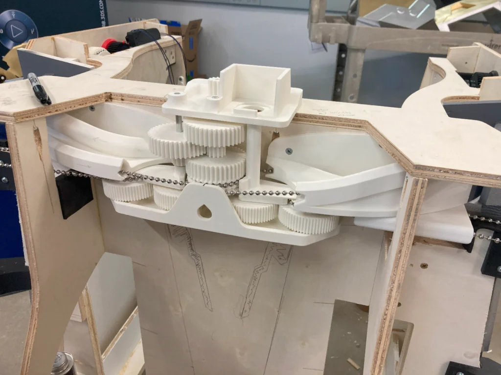 To convert the rotation motion of the bead gear into the lifting motion of the wing tip, Chinloo designed and 3D printed a multi-layer assembly of rotating components connected to a rib system that was cut out of plywood. This complicated junction exists at the “elbow” of the wing, housing all of the necessary components to make the wing mechanism work.