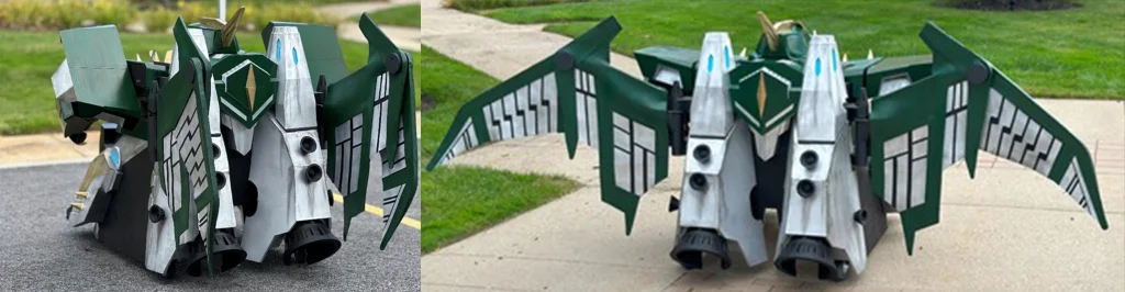 With any engineering project, the beginning stages include lots of brainstorming, prototyping, and trial and error. But ALSO – lots of fun and collaboration! The SOLIDWORKS Magic Wheelchair team ran through many iterations of ideas for Adrian’s Magic Wheelchair costume: a transforming dinosaur robot. Dan DeOreo presented the Transformer character Swoop to the team as a great design inspiration. Chinloo Lama created a proof-of-concept with a coffee stirrer, index card, pencil, and string, turning what a non-engineer would think of as “random office supplies” into a miniature wing prototype that could flap up and down.