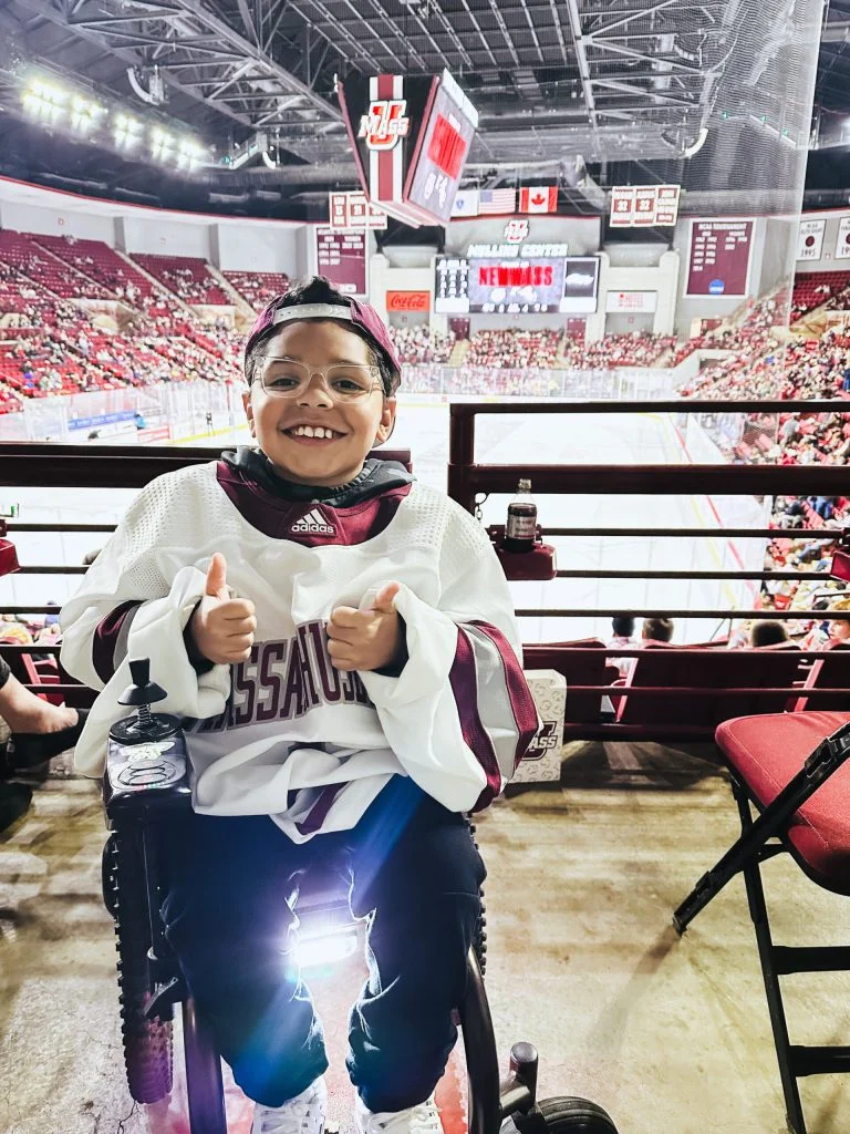 He also is everywhere. Adrian is a beacon of positivity and wants to see and do everything, which he documents on his Instagram account, @rollingwithadrian. Whether he’s trying new restaurants and doing food reviews, pumping up the UMass Amherst hockey team as an official member (courtesy of Team Impact), or being an incredible example and friend to his little brother Mateo, Adrian is always up to something and making it exciting.
