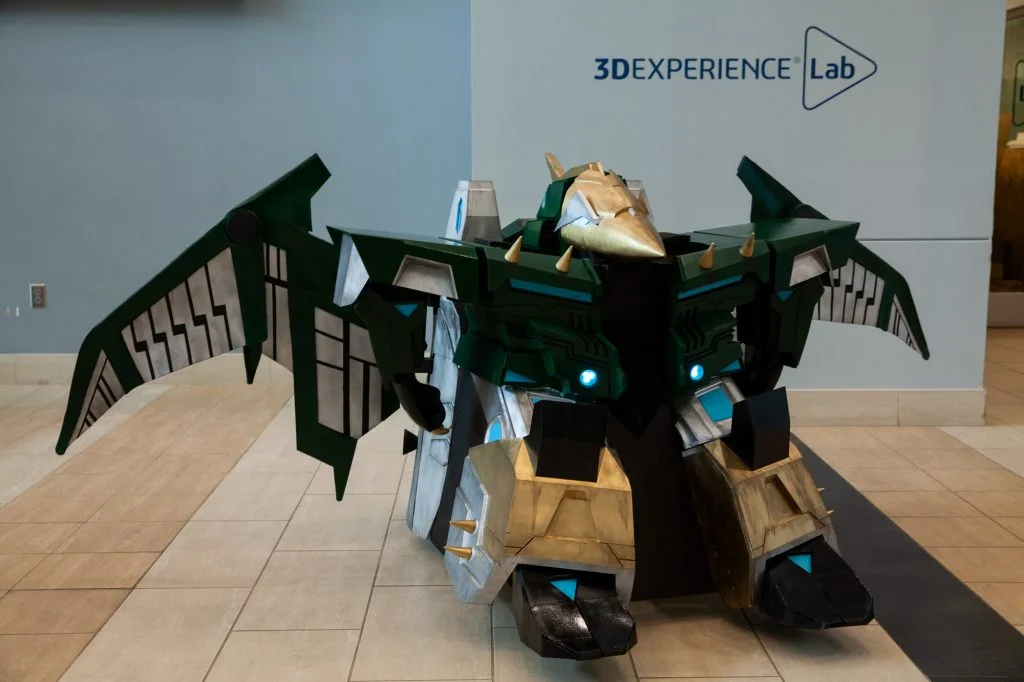 Adrian’s costume and reveal would not have been possible without the hard work of dozens of people. The SOLIDWORKS build team were given an incredible challenge this year and they hit it out of the (Jurassic) park. Here are all the build team members, along with their favorite dinosaur: Dan Deoreo (design and fabrication of arm mechanism, Velociraptor), Gabe Enright (voice and sound effects, Hadrosaur), Hannah Gilmore (logistics support, painter, Styracosaurus), Albert Hernandez (costume designer, Albertosaurus), Chinloo Lama (colors, foam work, wings, Triceratops), Max Lama (3D print slicer, assembler, modeler, Ankylosaurus), Sal Lama (team leader, frame maker, gear train expert, Stegosaurus), David Law (painter, foam builder, gluer, Ankylosaurus), Yun Li (electronics for motor control, Dracorex), Rachael Naoum (cyber clothier, Hettangian haberdasher, Ichthyosaurus) Jason Pohl (trailer lender, all-around good guy, Ankylosaurus), John Sweeney (dinosaur chauffer, another all-around good guy, Velociraptor), and Sara Zuckerman (logistics, documentarian, Dilophosaurus).