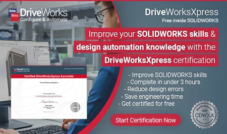 The DriveWorksXpress Associate is the first level of DriveWorks Certification. DriveWorksXpress is included free with every seat of SOLIDWORKS. The training and certification is free and available to all engineering and design professionals and students who have access to SOLIDWORKS.