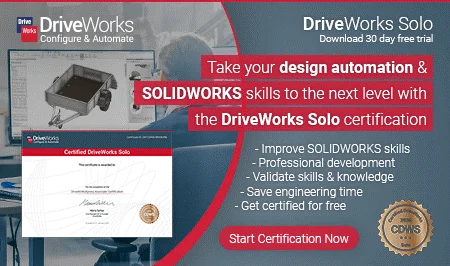The DriveWorks Solo Certification is brand new for this year. It’s a free certification available to all engineering and design professionals and students who have access to SOLIDWORKS and DriveWorks Solo,including the 30-day free trial.