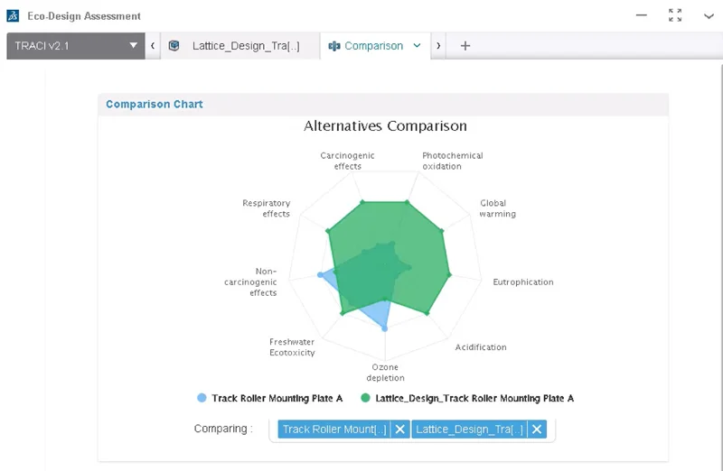 With assembly visualization, it’s easy to visualize sustainable impacts in context of the 3D assembly. The least sustainable parts of your assembly are highlighted on the 3D model, so you know where to focus your efforts. And you can also make comparisons between design alternatives in a single assessment.