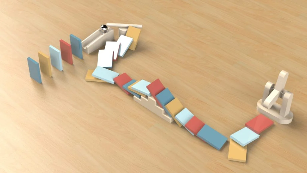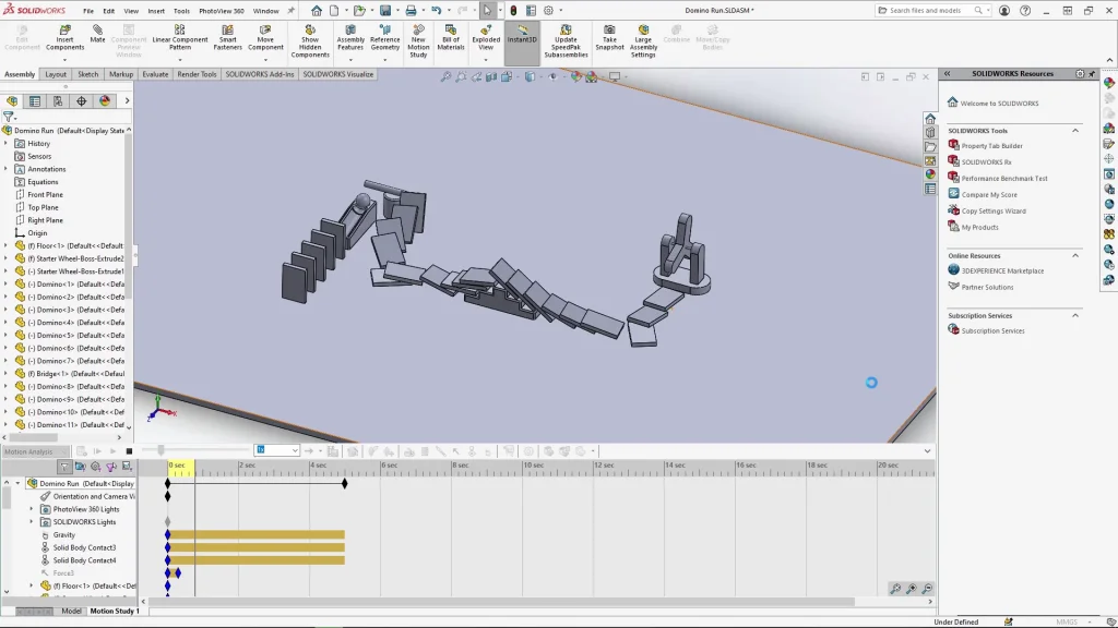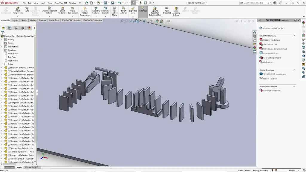 Most of the parts that sit onto the ‘floor’ part are actually mated to the top plane, the reason for this is that, when I am laying out the domino run I want the pieces to stay roughly were I place them. But, if I mate pieces onto the floor rather than the top plane, they move away from where I dropped them, whereas with the top plane they just move down to sit onto it. The tack pieces apart for the moving parts are fixed in position, along with the floor as we don’t want these to move or have any influence on the dominoes. The moving components are mated in position to rotate, and the ball is mated concentric to the top of the ramp. With everything in place the motion study could be set up.