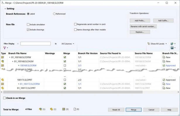 Once the new design changes have been approved, I can use the Merge command to update the original files with the changes as a new version in PDM (Figure 4). No need to rename the copies and overwrite the originals. The complete history of the files is maintained in PDM for traceability. If the design change is rejected, I can delete my concept models and the branch will no longer be available.