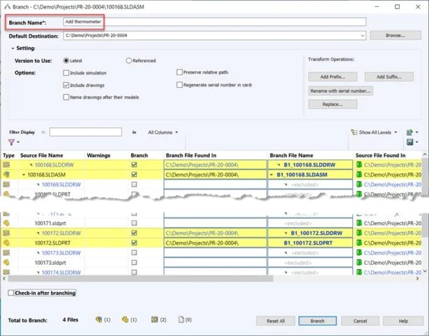 The Branch command is closely modeled after the SOLIDWORKS PDM Copy Tree command. In fact, the only major difference is the requirement to create a distinct name for the Branch. Having a unique name allows you to create multiple branches of the same design if desired (Figure 2).