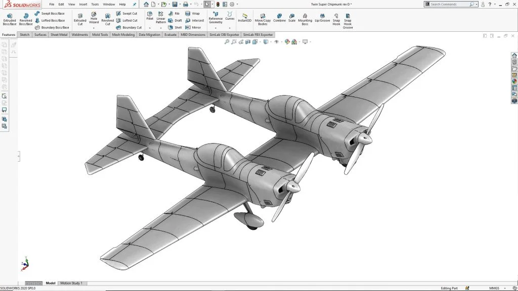 The success of that project got me questioning: would double the Chipmunks equal double the fun? By that, I mean can I successfully develop a 3D-printed, twin-engine version of the Super Chipmunk, with two fuselages bridged together with a center wing and horizontal stabilizer? My hypothesis was “yes,” so I set out to prove it. But building a twin version of the Super Chipmunk wasn’t as simple as just 3D printing two of each part and gluing them all together. There were several new design elements and engineering problems I needed to research and figure out in SOLIDWORKS before printing any parts.
