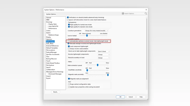 Open large assemblies faster than ever with the new option to have them always open in Resolved mode. Of course, you still have the option to toggle between Resolved Mode and Lightweight Mode, but for those of you who don’t want to think about it just select “Automatically optimize resolved mode, hide lightweight mode” under Assembly loading in the Systems Option – Performance dialog box.