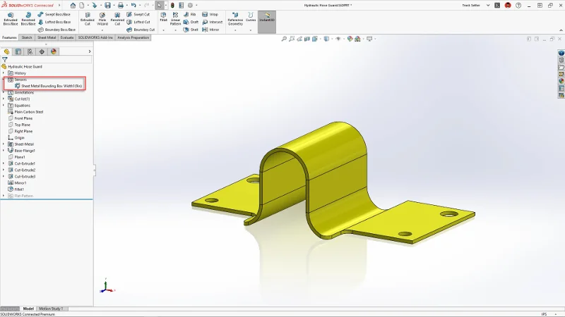 Catch design errors before you send your models to manufacturing. You can now turn on the new sheet metal sensor setting to warn you if the flat pattern of the sheet metal part exceeds width, length, area, or the bounding box area blank values.