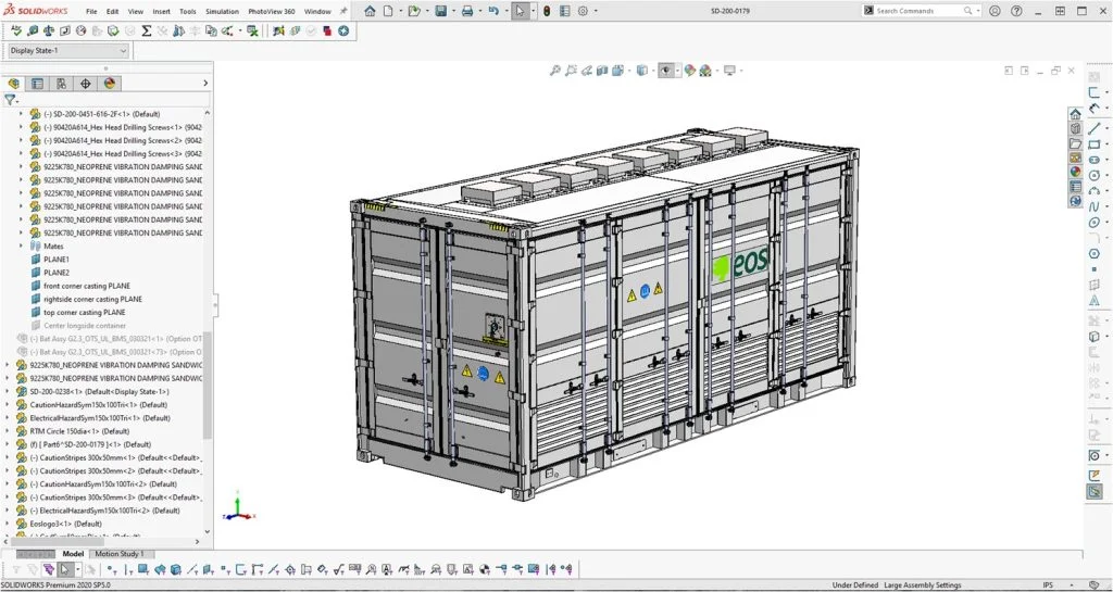 Since adding SOLIDWORKS Simulation solutions and beginning SOLIDWORKS PDM implementation, Eos has shortened its development cycle from multiple years to months and realized 60 percent higher output through the improved design and performance of its Gen 2.3 battery. Plus, the company has advanced the development of its Gen 3 battery, which increases container storage capacity from 500 kWh to 750 kWh.