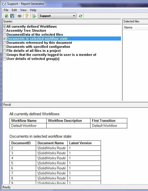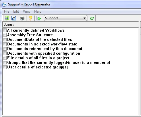 A number of sample queries are distributed with SolidWorks Enterprise PDM and can be added to the report generator. The sample reports can be accessed on a client, by clicking on Report Examples 1.crp in the SolidWorks Enterprise PDM installation directory. The sample queries include ‘File Details’, ‘List all Referenced Docs’, ‘List Work Flows’, ‘Group Members’, ‘Documents in Workflow State’, ‘List Assembly Tree’ just to mention a few.