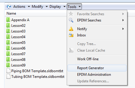 The SolidWorks Enterprise PDM Report Generator can be used to search in a selected file vault for information that you can specify in one or more queries.