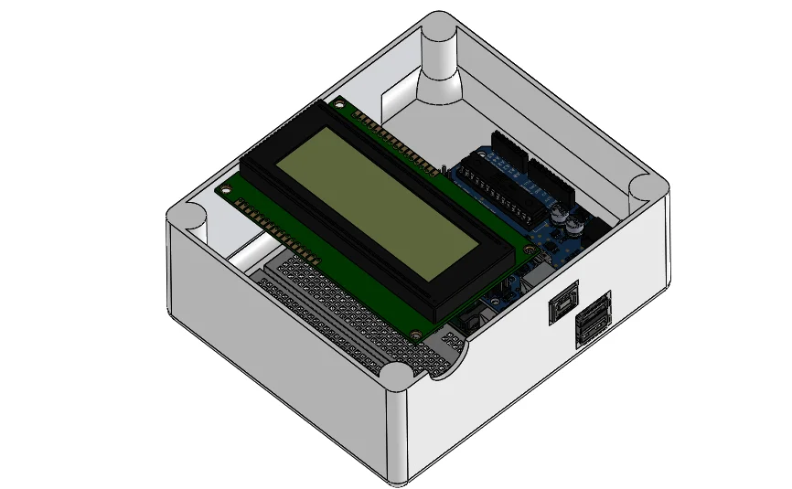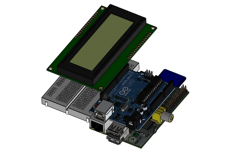 I knew I wanted a simple enclosure to contain all of the components, but I didn’t know exactly what the enclosure would look like or how the components would be oriented. At this point, I went to the internet and found some CAD models for a Raspberry Pi, an Arduino, a breadboard, and an LCD display. With these 3D models now in a SOLIDWORKS assembly, I was able to align them how I wanted them to sit and use top down design methods to create an enclosure to house them.