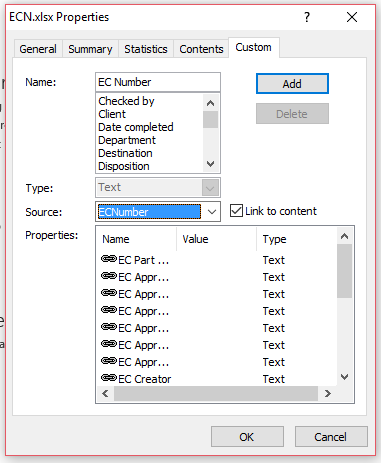 In the dialog that shows we go to the Custom tab. Here we find a list of properties that are already defined. If your variables haven’t mapped to the file yet, that is fine as we will create the link here. If they are mapped that is fine as well, we will link their pre-existing values to ranges. To do this, we can select the name in the list or type a new name.