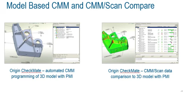 Another partner Origin has developed applications for programming Coordinate Measuring Machines (CMM) and checking CMM inspection results and 3D point cloud “scan data” against the original 3D CAD model. Origins’ CheckMate is fully integrated with SOLIDWORKS MBD and provides a Model-Based Inspection (MBI) capability for CMM programming. It reads SOLIDWORKS MBD models, GD&T, and associated coordinate systems to automatically program CMM code per your MBD specifications. CMM programming time can now be cut from hours down to minutes, and it also greatly reduces human errors. After a quick CMM simulation, the program can be loaded to all CMM machines with no manual edits required. Finally, CheckMate automatically generates reports by comparing the ideal design model against CMM-sampled coordinates or 3D-scanned point clouds.