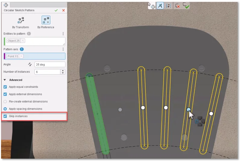 Within the Sketch Pattern command, there’s now an additional checkbox for skipping instances. When you select it, you can use the manipulators to deselect instances of that pattern that you don’t want created. It’s particularly useful when instances of a pattern overlap with other geometry or holes, in which case, you don’t want to apply the pattern to those areas so you can just skip them and leave them out of your pattern.
