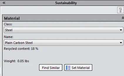 On top of the structural properties, the library is enriched with SOLIDWORKS Sustainability. In this example of environmental impact simulation tools, the available materials include Sustainability data from GaBi LCA Database.