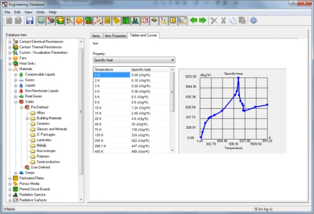 On top of the structural properties, the library is enriched with SOLIDWORKS Flow Simulation and the Engineering Database, which contains unit systems, physical properties of fluids and solids, characteristics of a wide range of engineering devices, custom visualization parameters, etc. It then offers, for example, temperature dependent solid properties (to take into account conduction phenomena). The Engineering Database can be, like the SOLIDWORKS Materials library, fully customized with user data.
