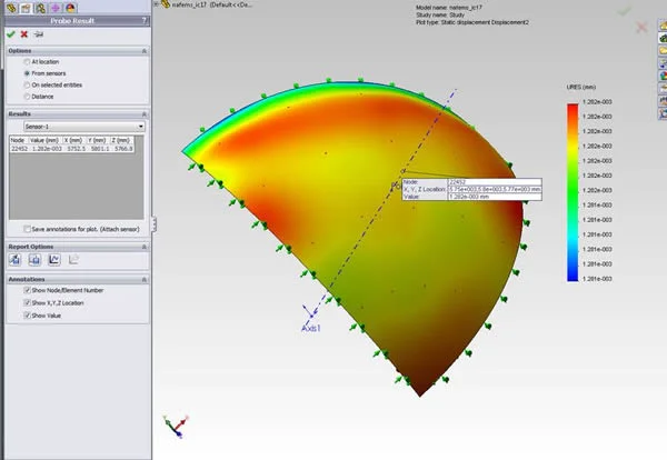 How do you create a smart model in SolidWorks for FEA analysis? Instead of creating the entire hemisphere, you model a 1/4 of the hemisphere and fix both ends. When you are trying to simulate thin walled vessels, you can use SolidWorks Surface features.