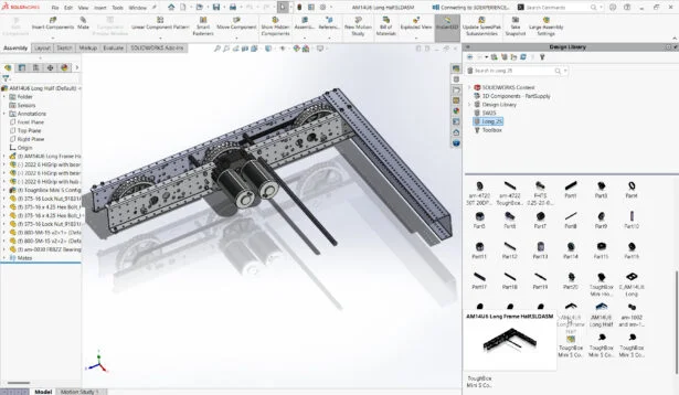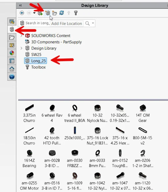 Select Design Library from the SOLIDWORKS Task Pane. Click Add File Location. Browse and select a Windows Folder that contains FRC KOP Models. Example Long_25.
