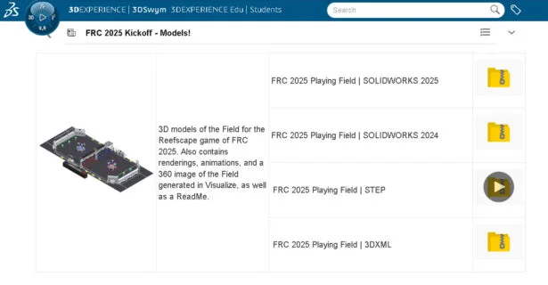 With SOLIDWORKS Cloud Apps and the 3DEXPERIENCE Platform, you will be invited to the FIRST Dashboard. The web-browser FIRST Dashboard contains a library of the FRC 2025 KOP and FRC 2025 Playing Field. You need your 3DEXPERIENCE ID to access these files from the Student Wiki.