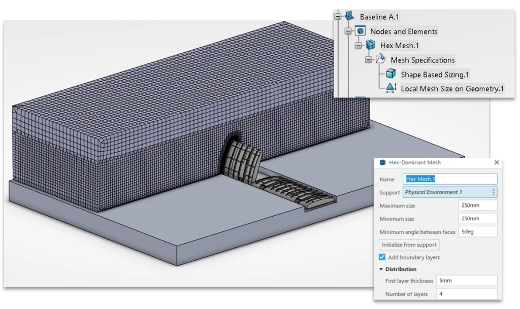 Clicking on the “Model” or “Mesh” tabs from the Assistant will seamlessly switch the user over to tackle Mesh creation. The software typically defaults to a hex-dominant mesh with support for boundary layer elements, but other options such as tetrahedral and swept mesh are available.