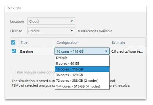 Either way, when selecting a larger instance type or specifying multiple simulations to solve in parallel, the software will provide either the required number of tokens or the estimated credit burn rate. In all cases, meshing and results post-processing is “free” and does not consume credits or require tokens.