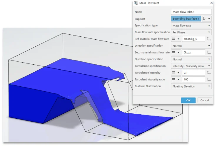 Thirdly, the software provides a number of special boundary conditions that are useful for open channel problems. This includes a “floating elevation” inlet which avoids the chicken-and-egg problem of trying to predict the hydraulic height or inlet waterline for a system, and built-in support for wave generation for marine applications.