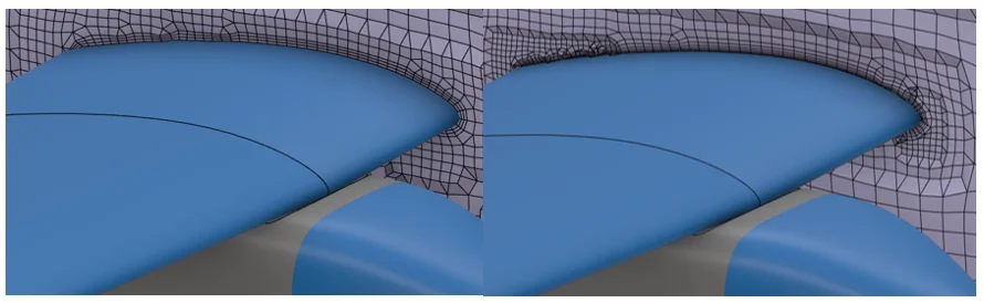 As you can see from the magnified view above, even with localized mesh controls placed there is still some geometric discretization error on the leading edge of the airfoil. Furthermore, since there is no dedicated boundary layer element definition there is not a practical means to fully resolve the viscous sub-layer if desired. In theory, the software would switch over to resolving the sub-layer if enough mesh refinement was present, but in practice it is just not feasible for real 3D problems with the nature of the meshing technology.