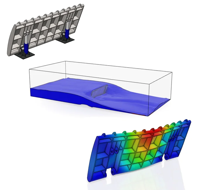 Figure 13. CAD Model, Fluid Simulation and Structural Simulation.