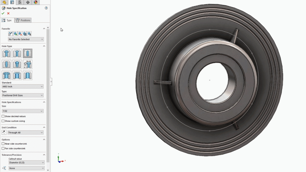 A new option located on the position tab in the hole wizard feature lets you leverage completed sketches to locate the hole wizard locations. For sketches with multiple segments, such as a segmented circle, rectangle, polygon, etc., hole wizard instances can be skipped as needed:
