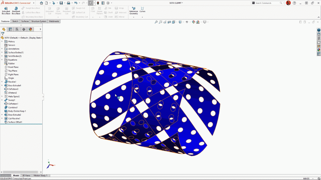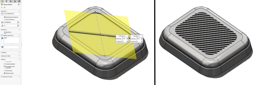 To complete the Rib design on this vent cover, a linear feature pattern would be perfect. Now in SOLIDWORKS 2024, there is an option for “Symmetric,” which creates bi-directional linear patterns with just one click: