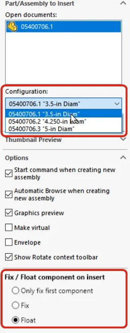 When inserting a component into an assembly, you can now select the default behavior from three options: Fixed, Float, or Fixed at Origin. These options are invoked when you do not manually place a component (uses the green tick mark to accept the placement):