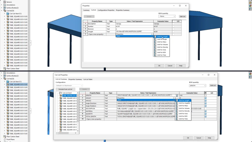 SOLIDWORKS 2024 also improves custom properties (and cut lists and BOMs) with the choice to add Unit of Measurement.