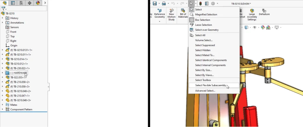 Before freezing a physical product, it’s a common practice to make sure all components are Fixed or Fully Defined. New in 2024, there’s a minus signal when a folder contains underconstrained components. Also, Component Selection now includes ‘Flexible Subassemblies,’ which speeds up selecting and switching them all to Rigid.