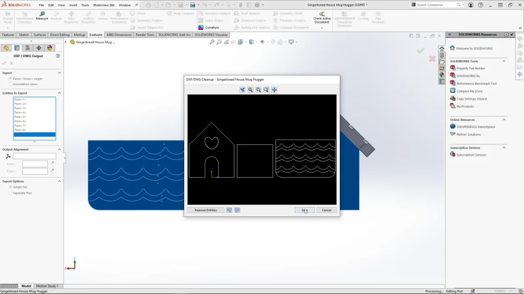Who doesn’t love festive baking? Well, it may not be for everybody but I’m sure you know somebody who enjoys it, so why not stick around to see how I created this simple one piece cutter to create a mini gingerbread house. For this tutorial I wanted to design one of those mini gingerbread houses that could sit onto the lip of my own coffee cup. This design will fit most cup diameters, but if you plan on adding it to a much larger or smaller cup, it might be a good idea to test it in SOLIDWORKS first. One tip is to cut the doorway slightly larger before baking. If you want to create the same cutter design as me, you will need to download the DXF file here, I have also provided my original gingerbread house model for download if you would like to use or edit this to design your own styled house. If you create your own design, like me, you will need to move the original gingerbread the side wall and roof panel to be facing the same way as the front of the house, this just makes it easier to create the DXF file as one, but also speeds up the modelling process of the cutter. All of my house panels were lined up to have a gap of 2mm between them, they were then exported as a single file DXF.